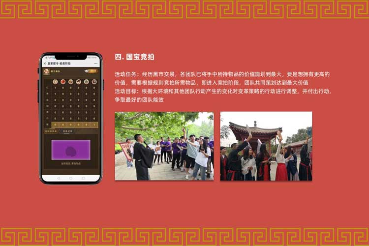 各组成员首先通过密令中的地图规划需要占领的地盘,占领该地盘后将获得随机国宝并与到达该地盘的所有团队PK获取指定国宝;北京拓展训练公司积累一定的国宝后可进入黑市交易你所需的国宝,因为不同颜色或品类的国宝将组合成不同的价值;***后,散落在当铺的部分国宝将会被拍卖,多少价格拍得什么品类及颜色的宝物将是团队间***后的博弈,团建活动策划所有团队拍卖后的资产组合兑现将一决团队价值胜负,价高者封王。